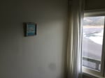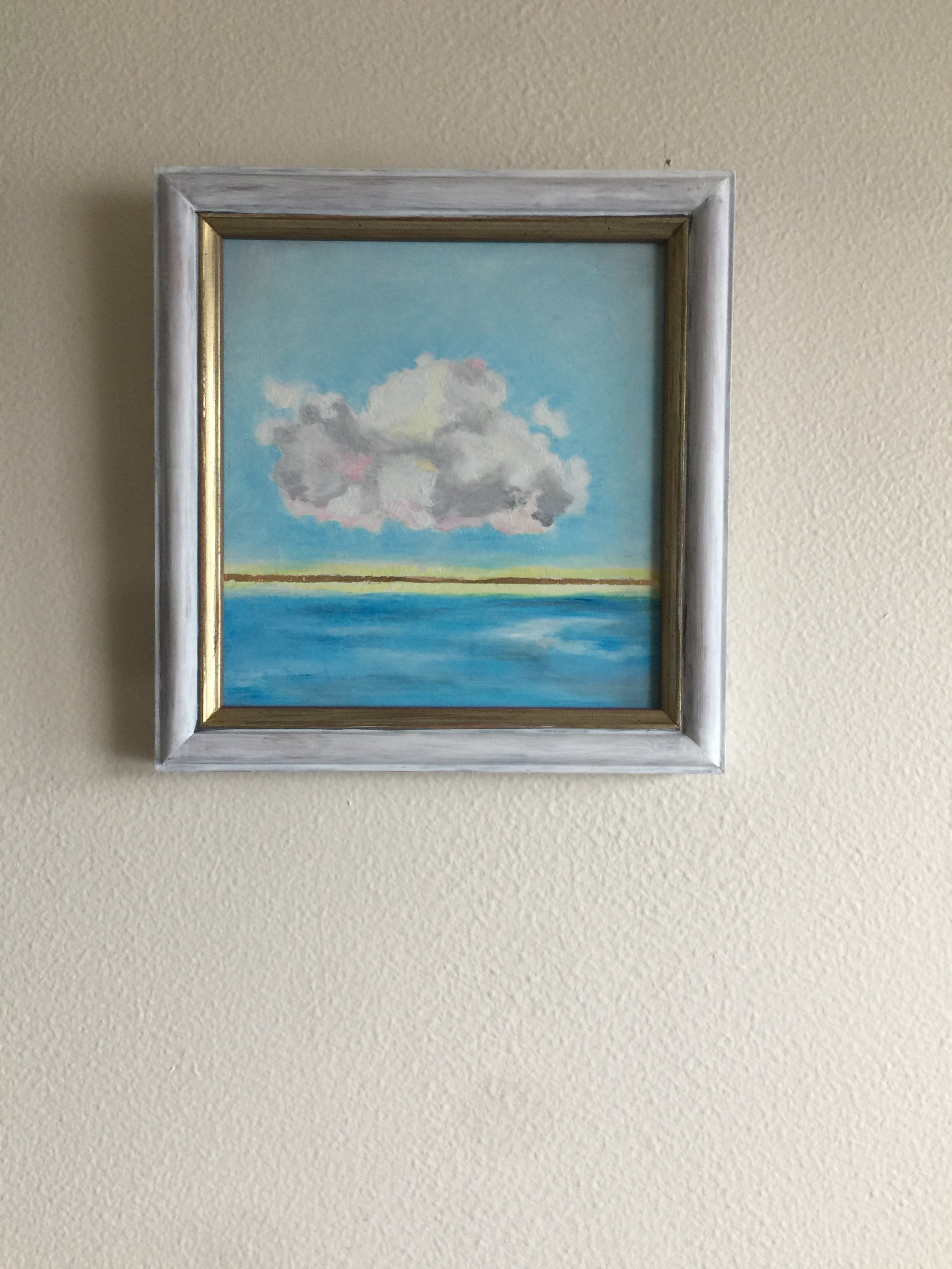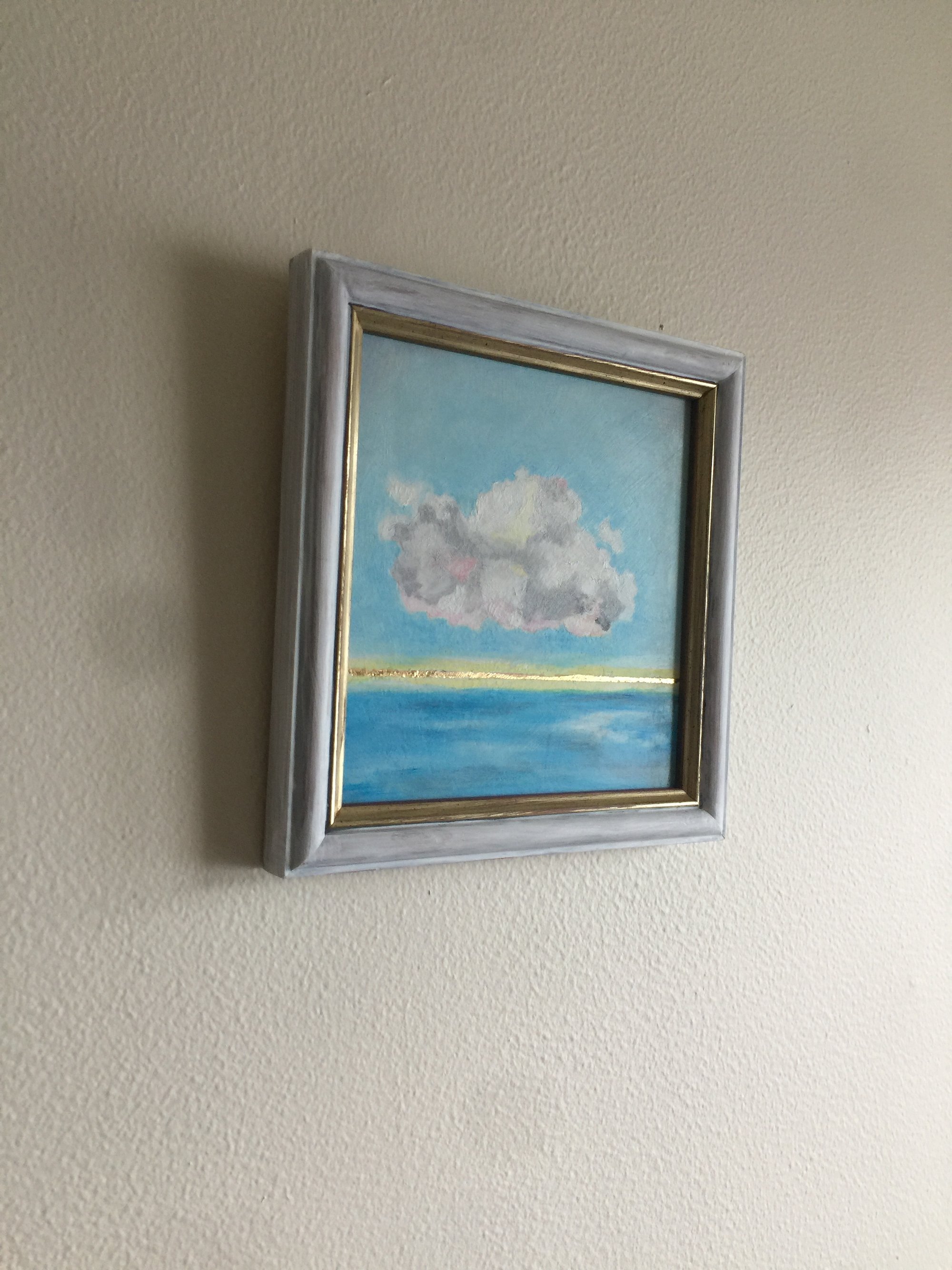 The prettiest tiny White cloud filled with color rests above a golden horizon line, deep Blue Cerulean sea. The intention of this painting show you a golden horizon waits just ahead.