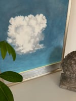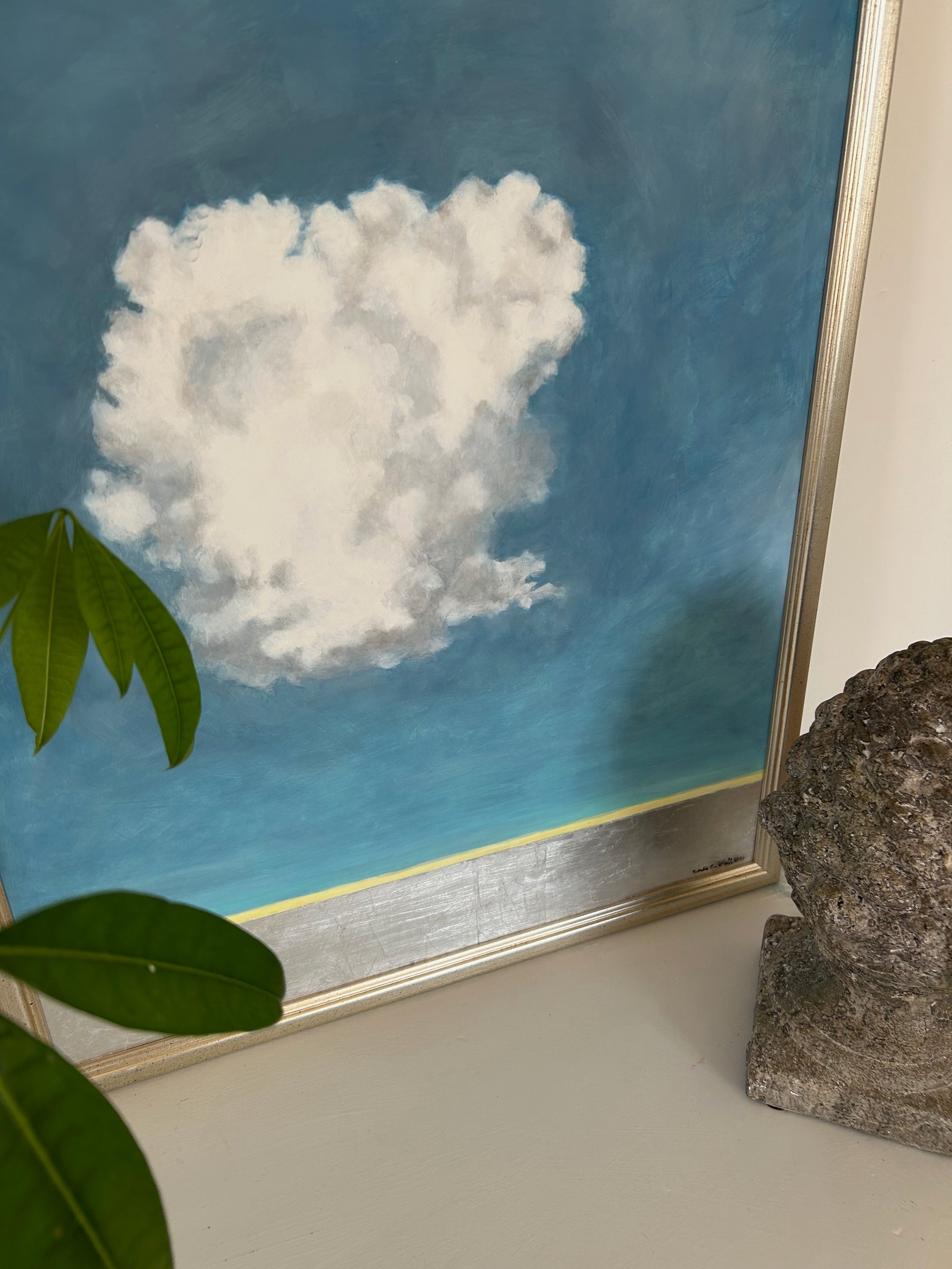 Big White cloud in Cerulean Blue Sky, Silver horizon. Keep your eye and mind on your Silver Horizon. Everything is playing out for your best path. This painting represents sky, sea and cloud, peace the unknown and hope.