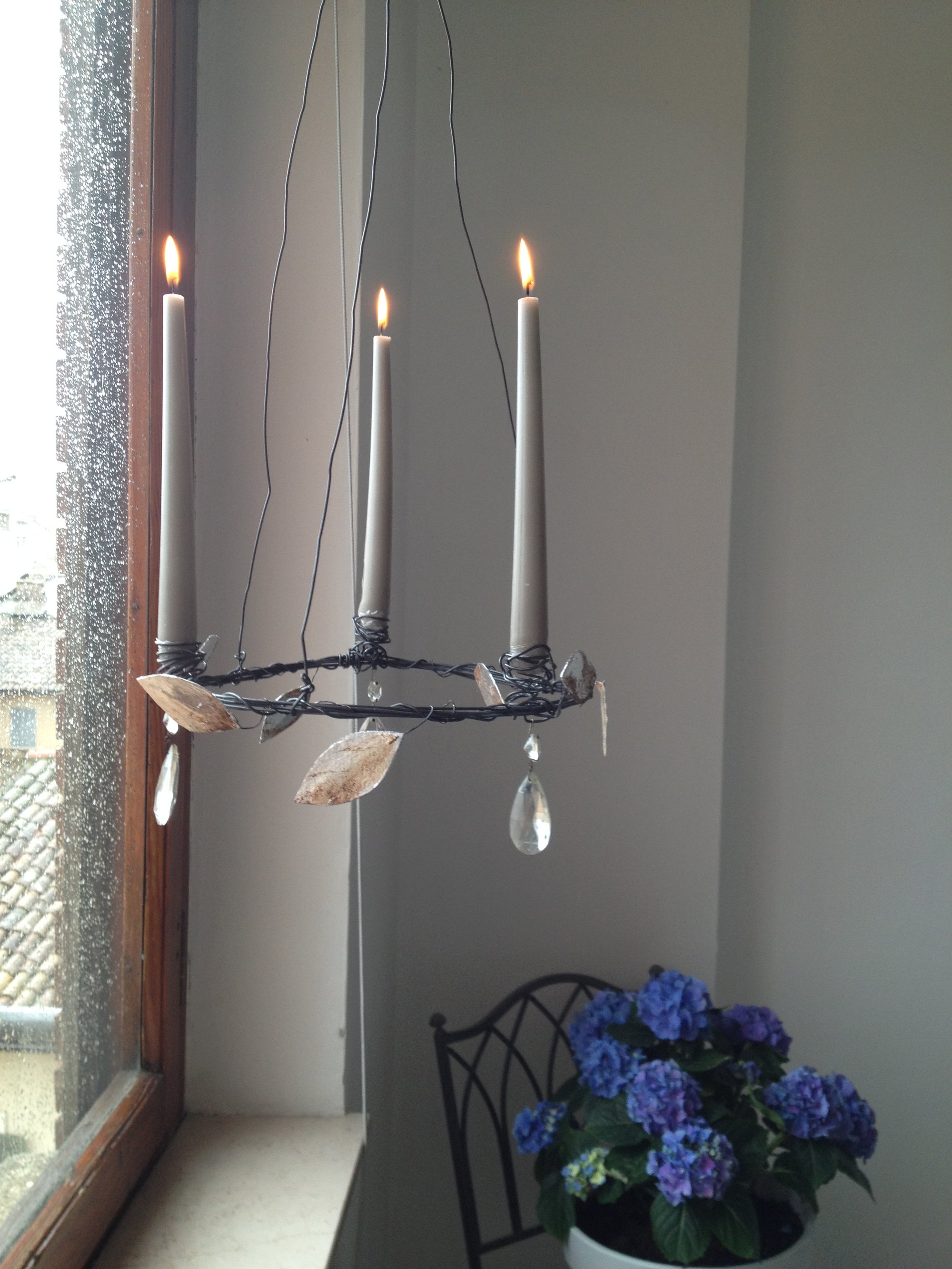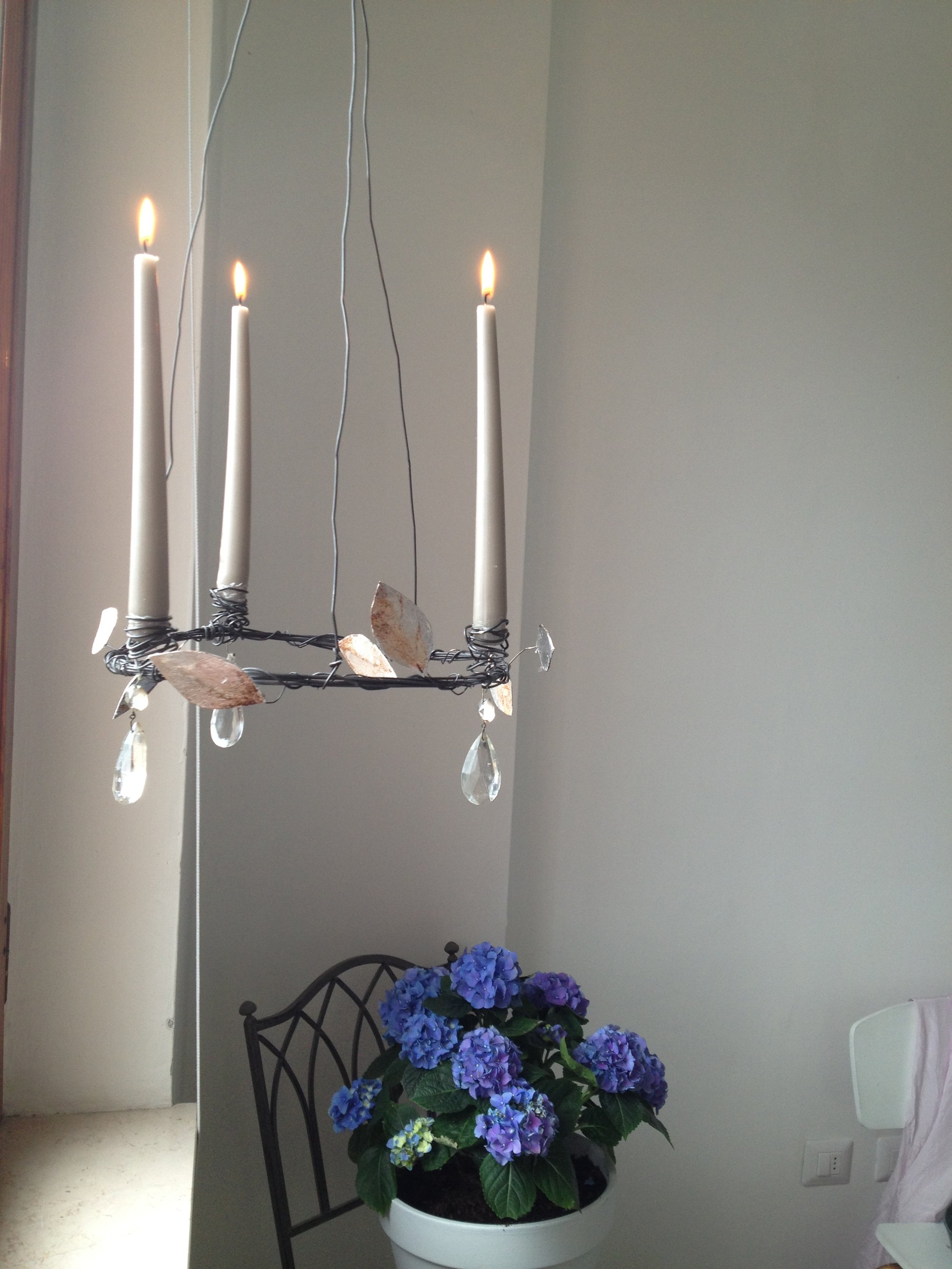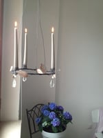 This Crystal and Silver Leaves Candelabra is formed in wrapped wire with 3 classic Italian crystal oval shaped drops. When the sun hits the crystals they cause a gorgeous display of rainbow prisms on the wall, reflecting on the wall as the Candelabra moves. The leaves are fastened on wire and can be adjusted as you like, they are made with silver leaf and antiqued in dark brown. It is a perfect design to embellish as you choose, add fresh flowers or greenery, ribbons, hanging love notes. Just make sure to watch how the candles burn down. This design is not heavy and can easily be hung with an eye hook where you most desire.