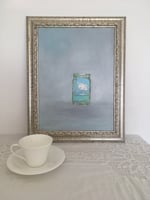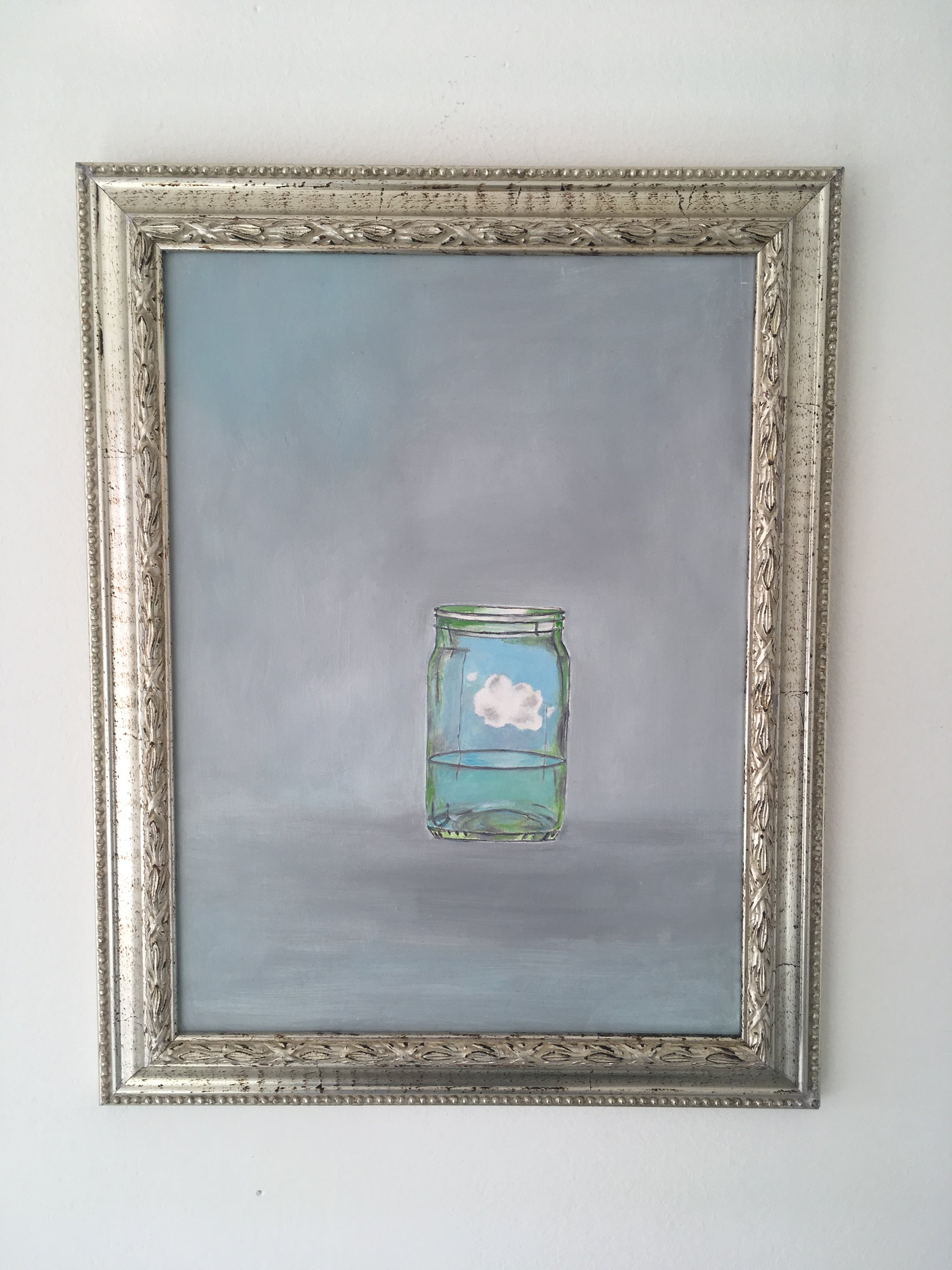 Tiny cloud in a blue sky floating above a serene sea of aqua blue water, inside a marmalade jar, expansive grey-blue back ground.