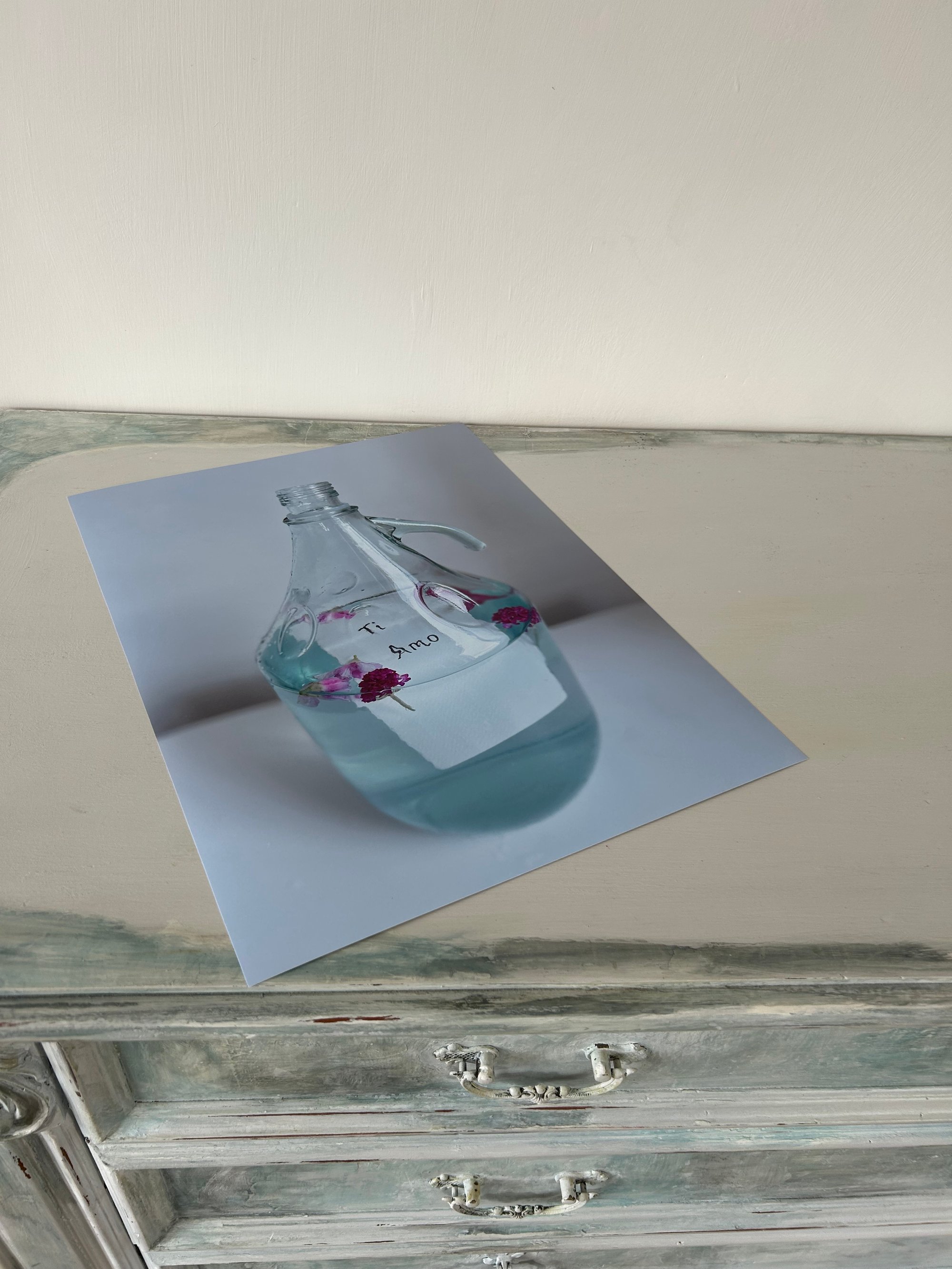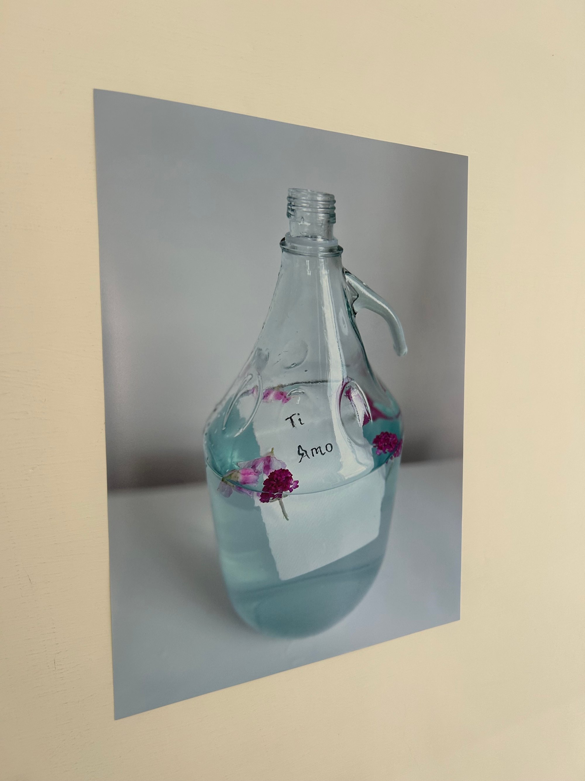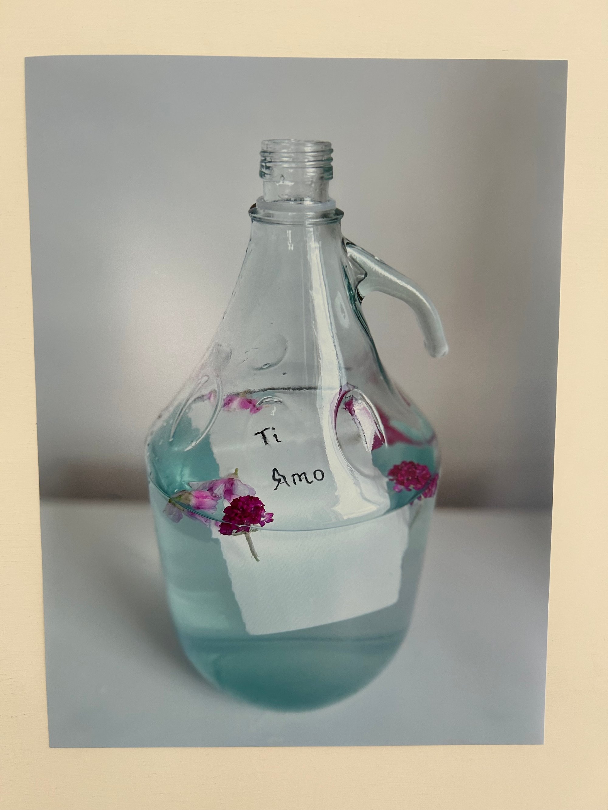 A note in Italian saying Ti amo (I love you) floating in clear blue water surrounded by flowers. A message to the world to be more filled with love to an your love, the huge Italian wine bottle is open, letting in air and hope, maybe it has arrived at its destination, it's home. If the world could run on love, peace would prevail for centuries.