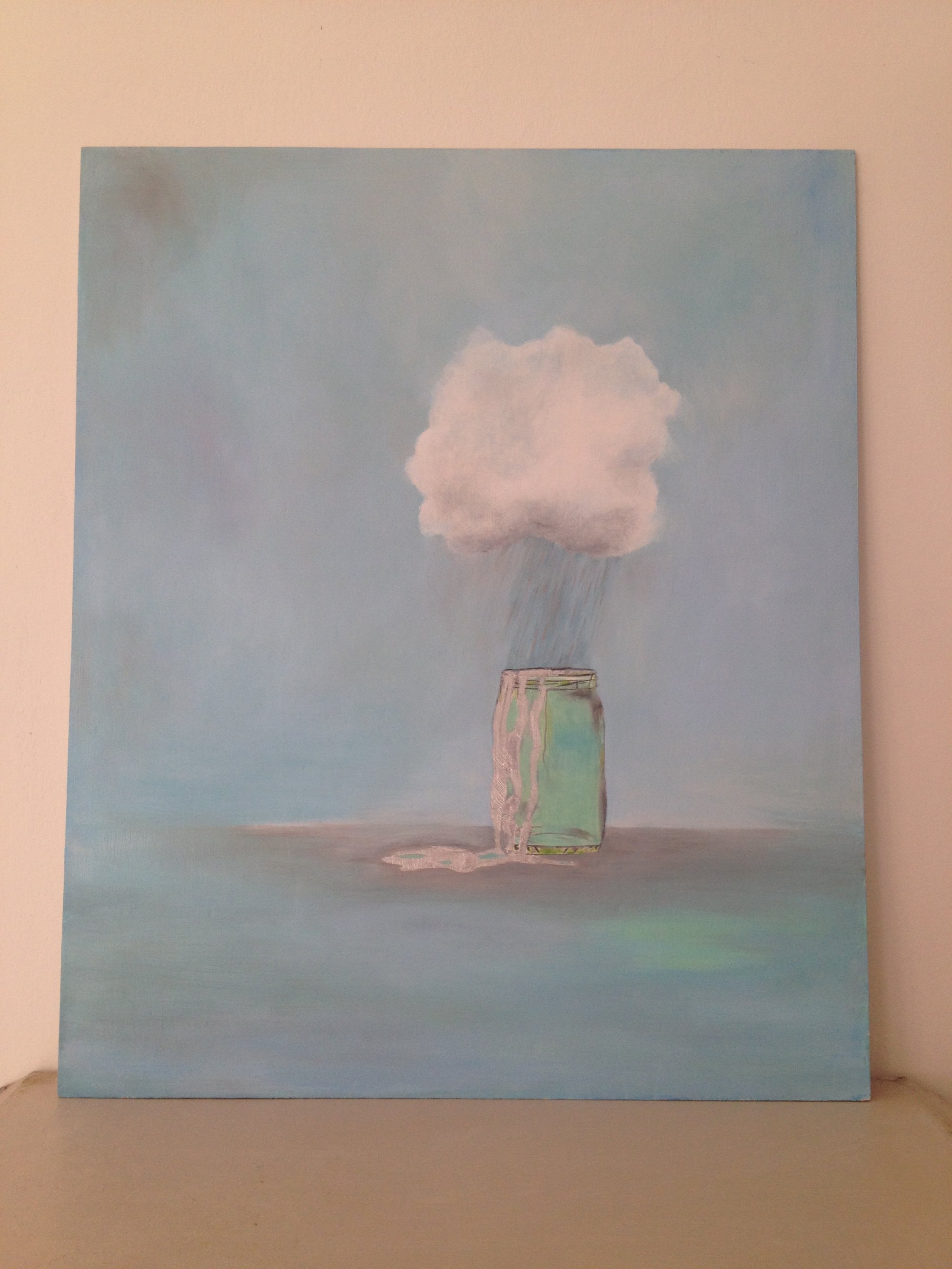 Rain cloud hovering above a glass jar. Pouring silver rain into the jar and overflowing into a pool of silver water.