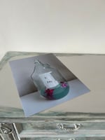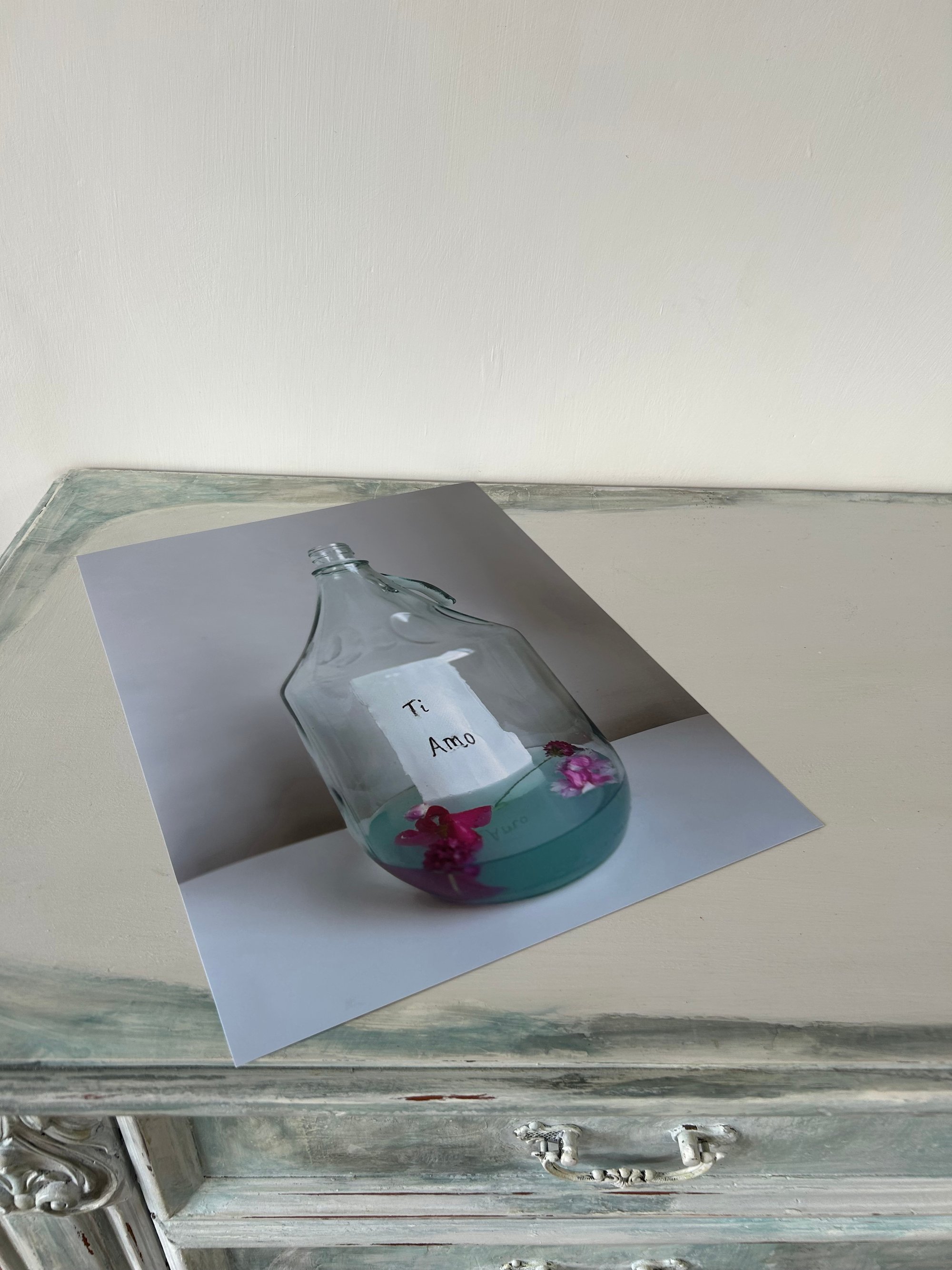 A note in Italian saying Ti amo (I love you) is a message in a big Italian wine bottle in clear aqua colored water surrounded by flowers. A message to the world to be more filled with love to an your love, air flows in like hope, maybe it has arrived at its destination, it's home. If the world could run on love, peace would prevail for centuries.